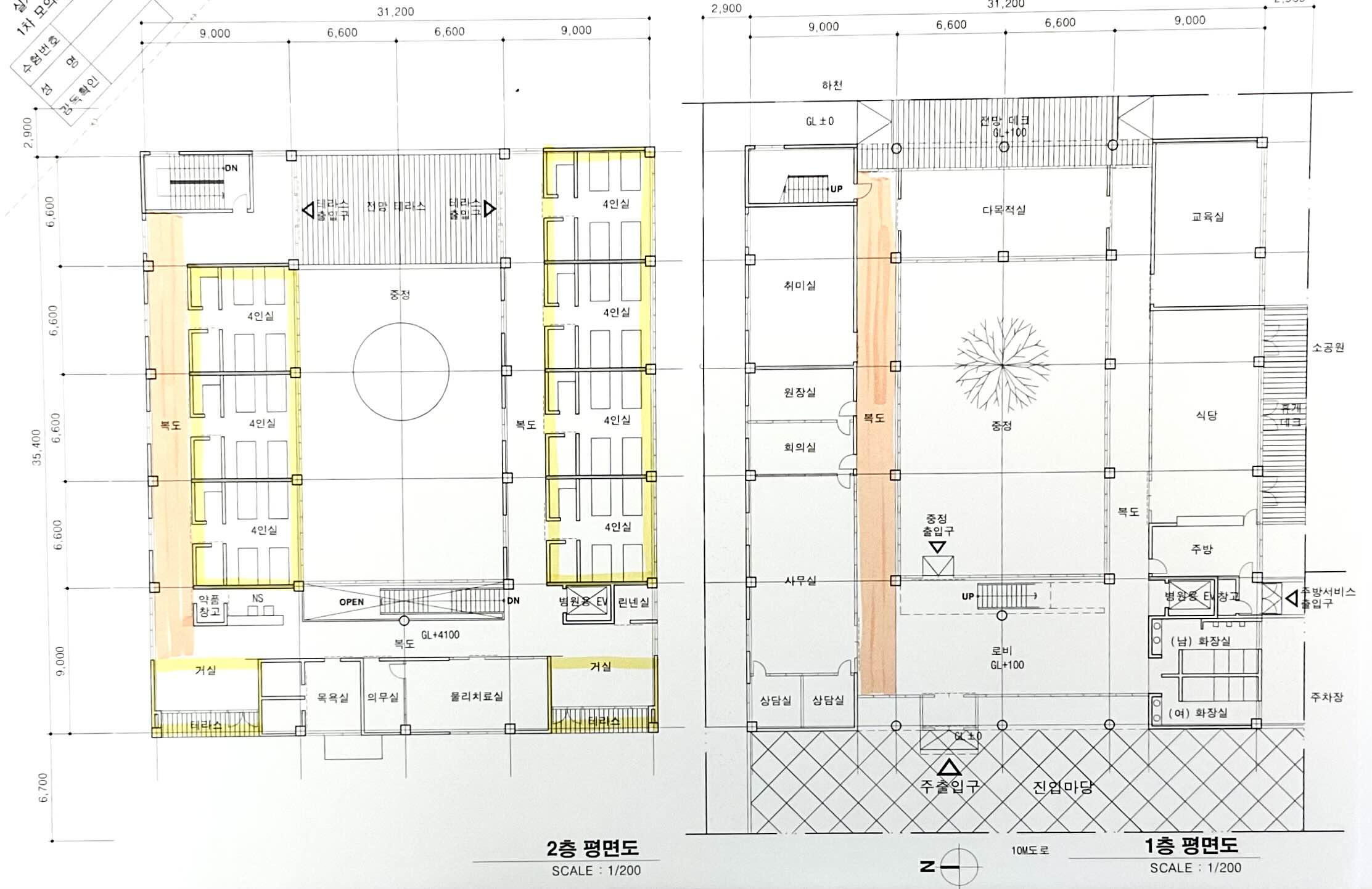 - 중정형 건물에서 객실 남향 또는 경관을 고려해야 할 때, 중정을 바라보는 쪽에 복도를 반대로 두면 모든 향을 남향으로 둘 수 있음