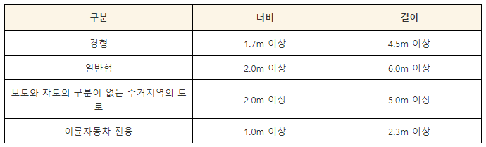 - 곡선 부분 : 자동차가 6m 이상 내변반경으로 회전 가능할 것 (50대 초과)