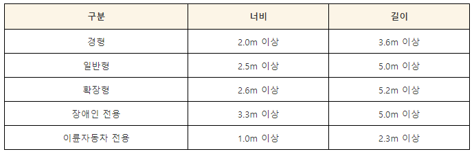 - 높이 : 주차바닥면으로부터 차로 2.3m 이상, 주차에 사용되는 부분 2.1m 이상