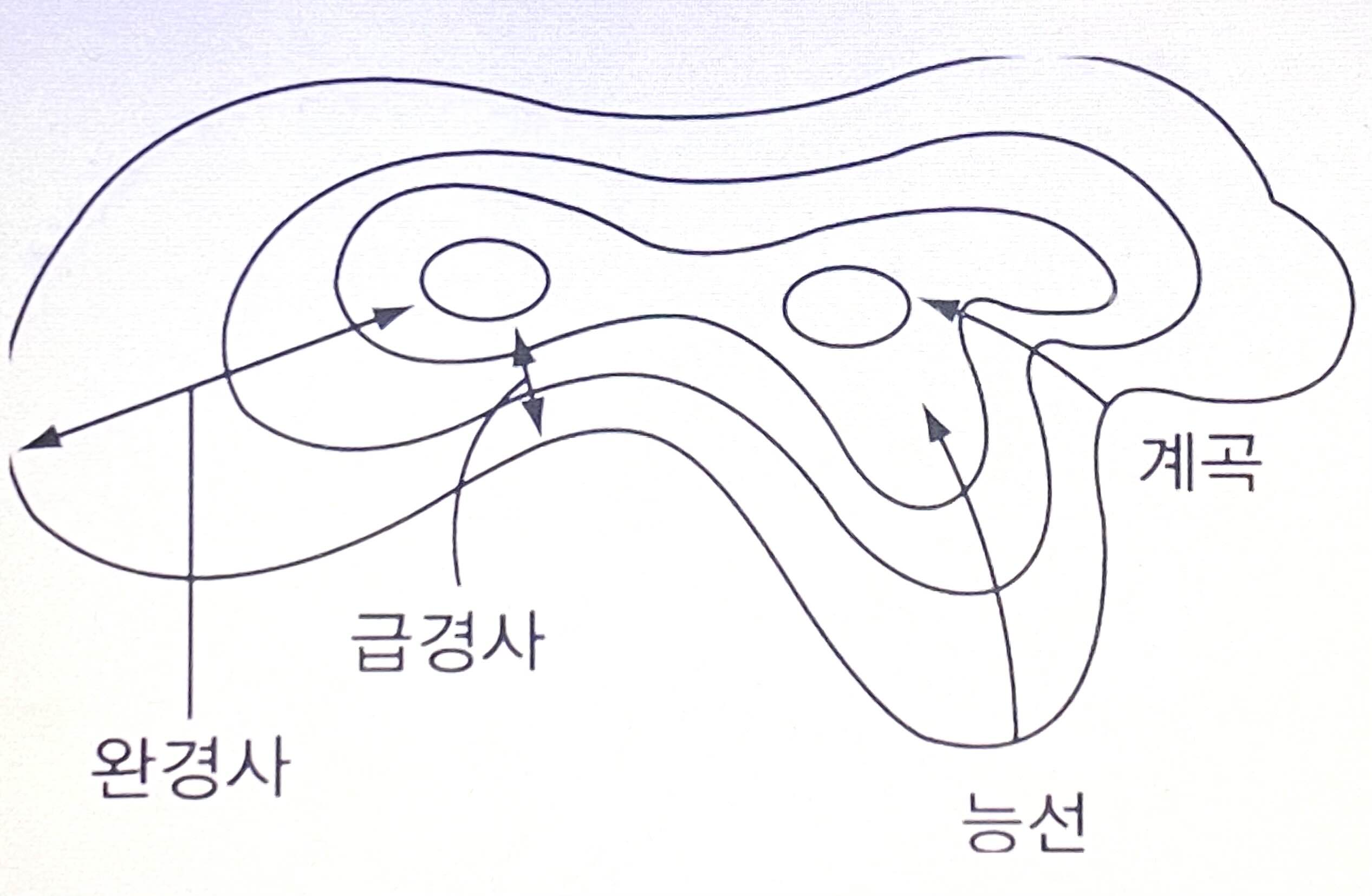 - 등고선 측면에서 보면 여러 개의 레벨을 갖는 등고선이 서로 수직이나 그와 유사하게 겹치는 형태